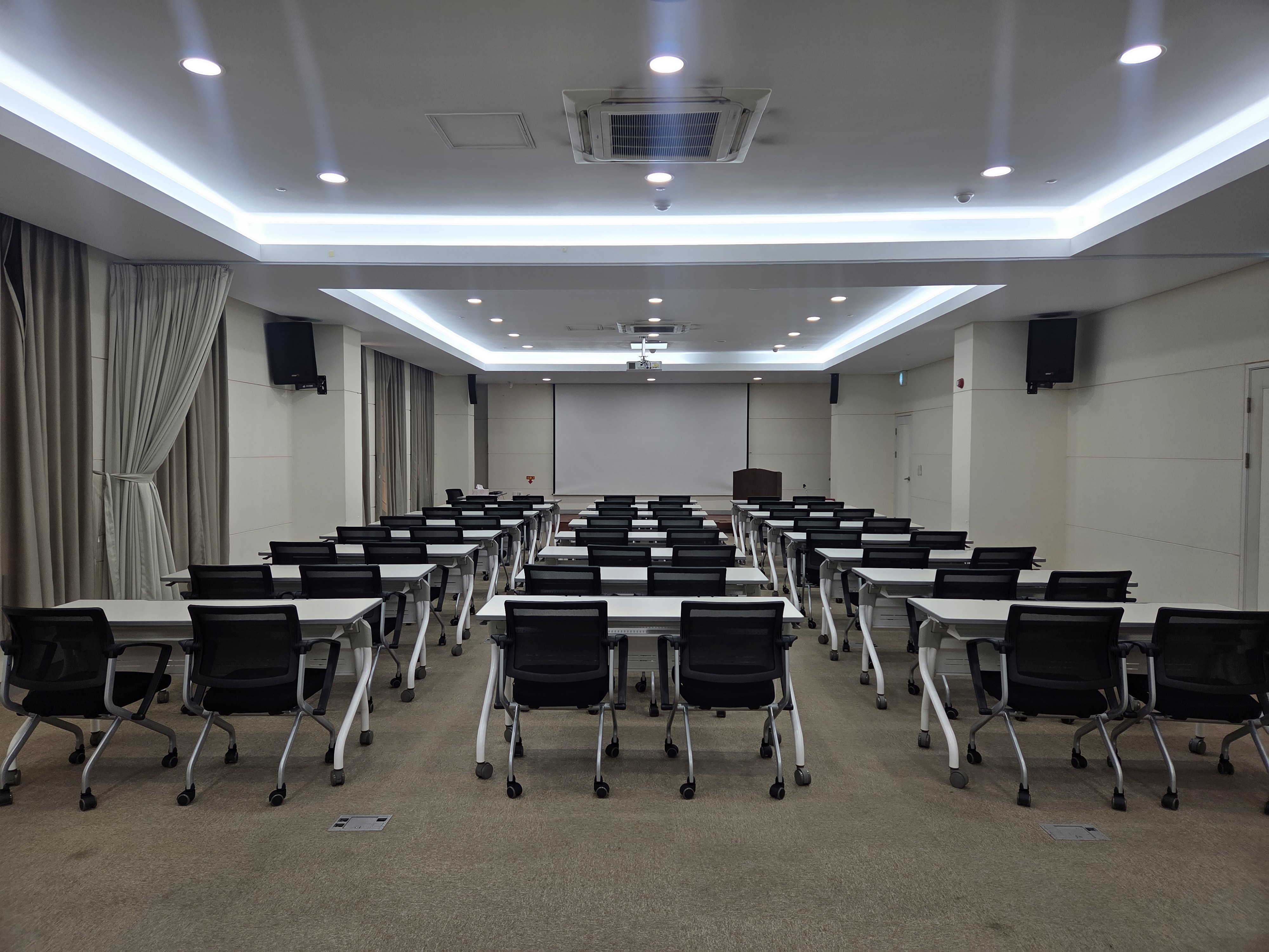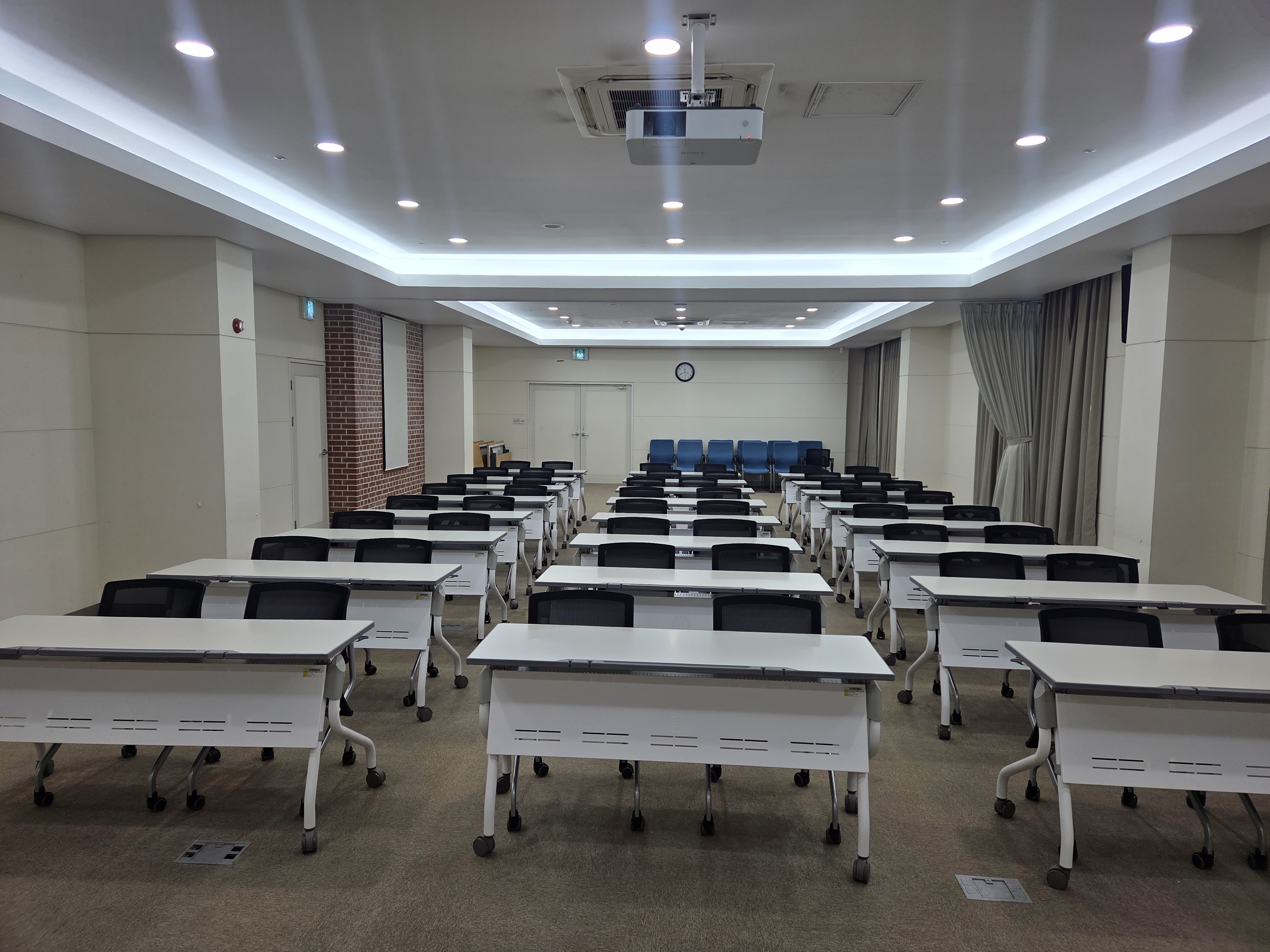 | 163.5㎡ (약 49.5평) | 약 48석 | 1회당 100,000원 (※부가세 제외) | 빔프로젝터, 냉난방기 스크린, 마이크, 책상, 의자 |