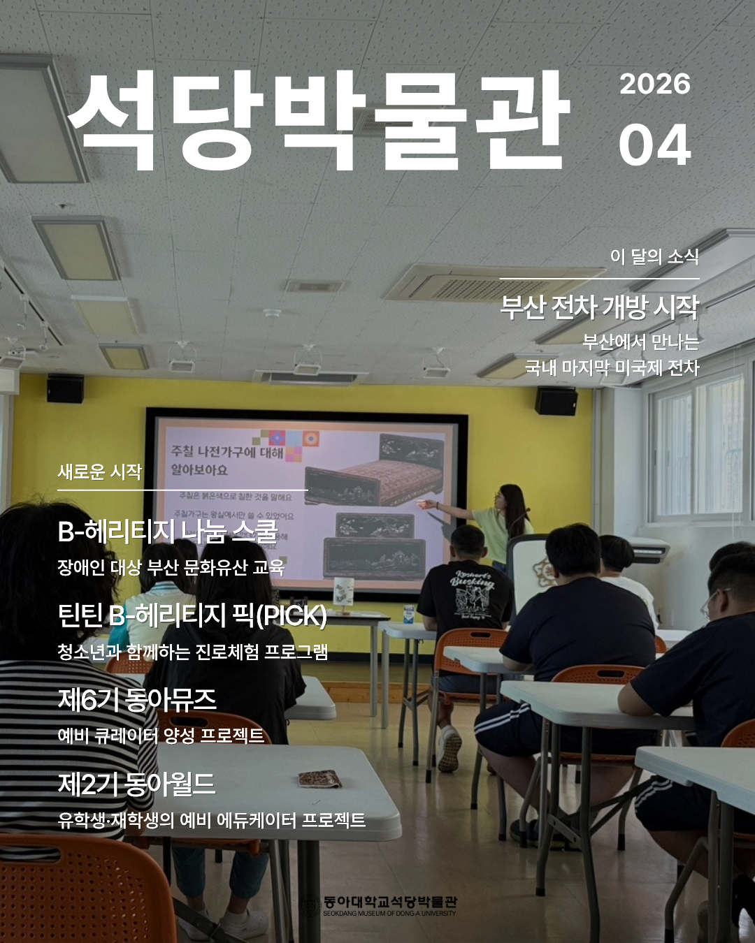 메인비주얼 동아대학교석당박물관 이전 장면 1 다음 장면 정지 재생 팝업존 1 이전 장면 정지 재생 다음 장면 관람 방법 전시 해설 시설 대관 사진자료 이용 온라인 전시 영상 전시 교육 모집 학술 보고서 새로운 소식 알림 더보기 언론보도 더보기 교육자료 더보기 큐레이터 추천 소장품 영산회상도 설명 바로가기 큐레이터 추천 소장품 바로가기 석당박물관 유튜브 이전 장면 다음 장면 붉은 벽돌이 들려주는 백 년의 이야기 배너모음 이전 장면 정지 재생 다음 장면